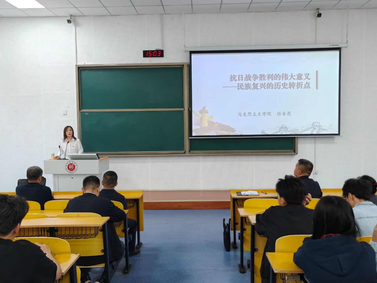 任金花老师的宣讲题目为《抗日战争胜利的伟大意义——民族复兴的历史转折点》。凭借深厚的学术功底和清晰透彻的理论阐释,任老师系统讲述了抗战精神的形成过程与当代价值。她带领师生共同回顾了那段艰苦卓绝的抗战岁月,指出抗日战争不仅是中华民族命运的重大转折,更是一次民族精神的深刻觉醒与升华。通过一个个真实而鲜活的事例,她深情讲述了先辈们为国捐躯的崇高事迹,深深打动了现场师生,激发了大家强烈的爱国情感与奋进动力。